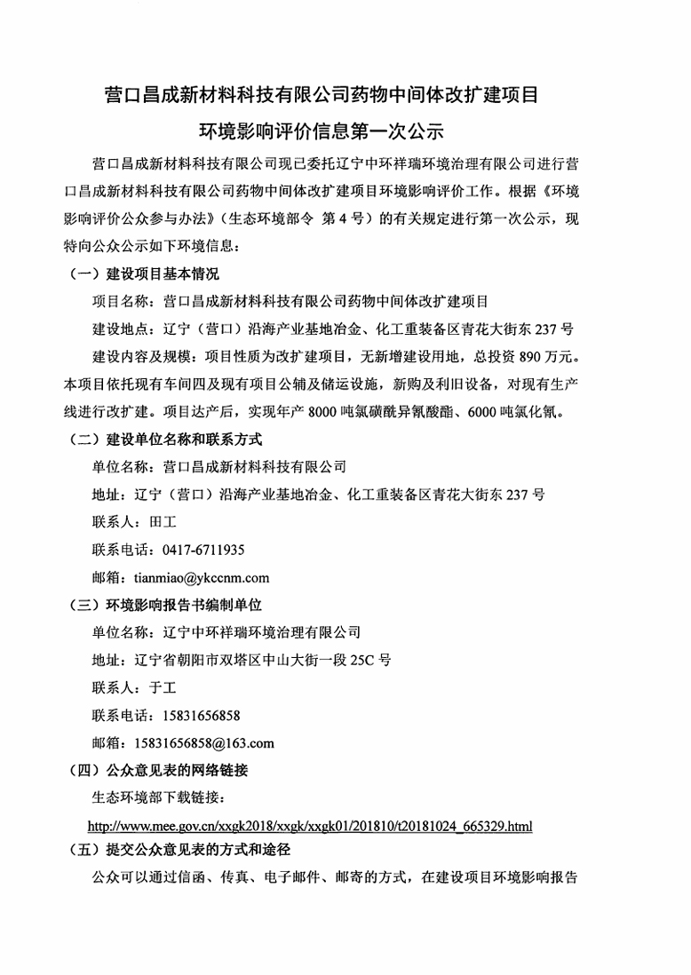 營口昌成新材料科技有限公司藥物中間體改擴建項目環(huán)境影響評價信息第一次公示