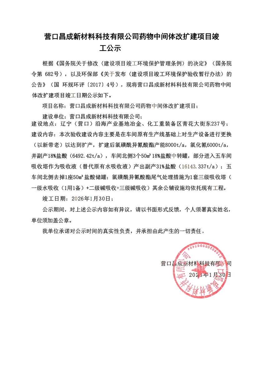營口昌成新材料科技有限公司藥物中間體改擴(kuò)建項(xiàng)目竣工公示